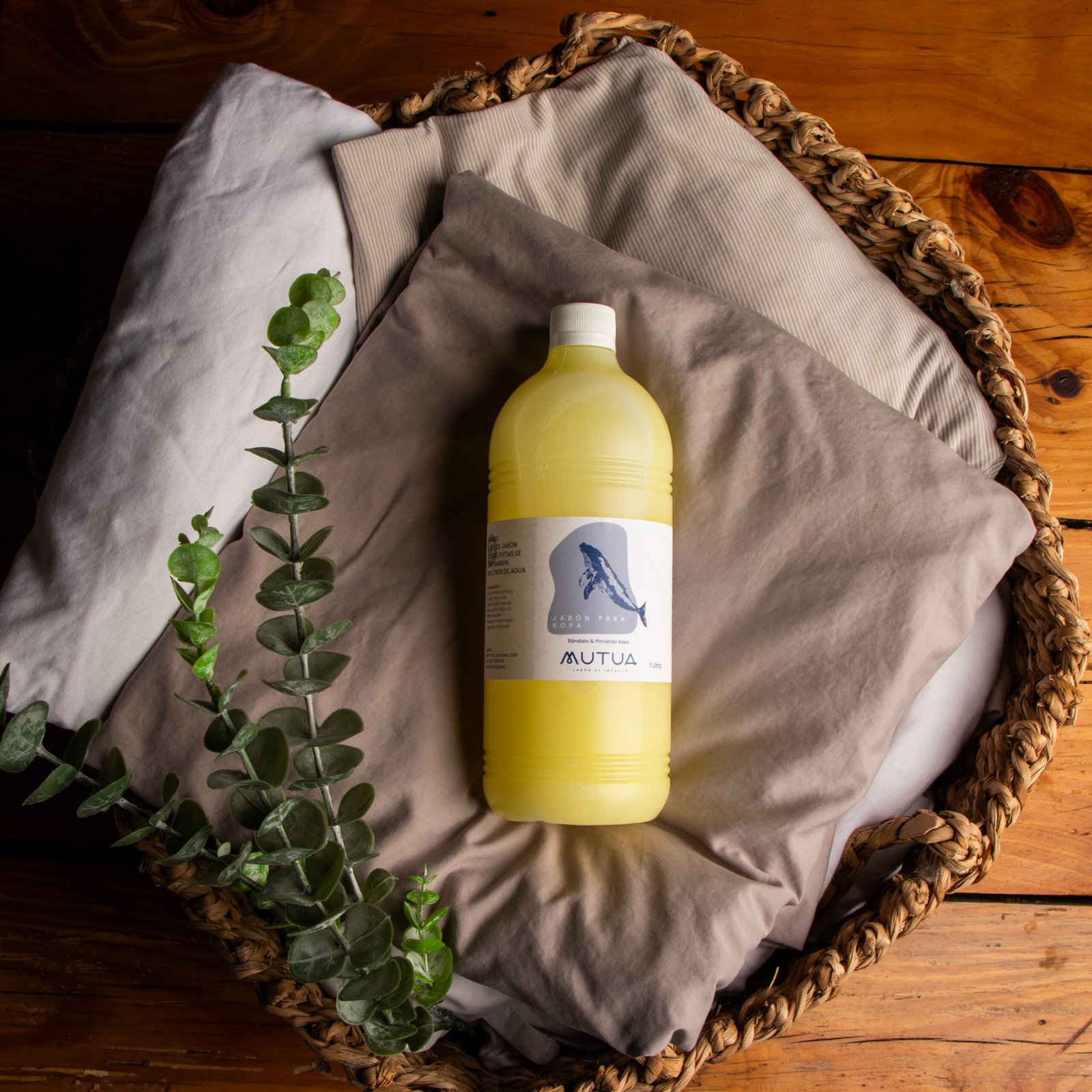 Jabón líquido para ropa Mutua con fragancia natural de sándalo y pimienta rosa